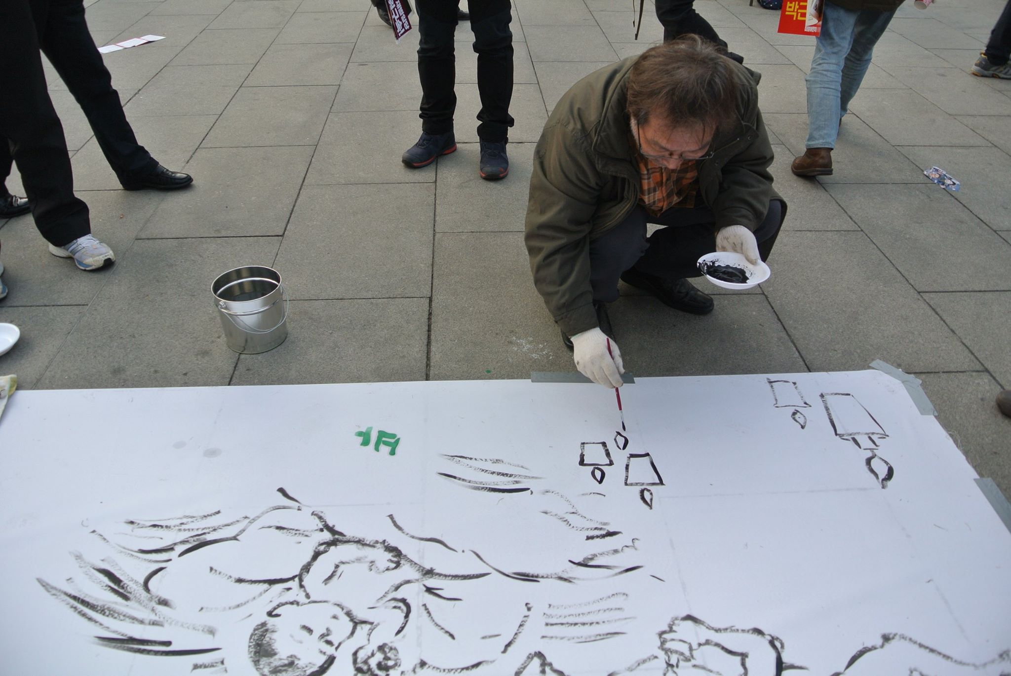 이순신 장군 동상 아래서 집회 참가자에게 캐리커처를