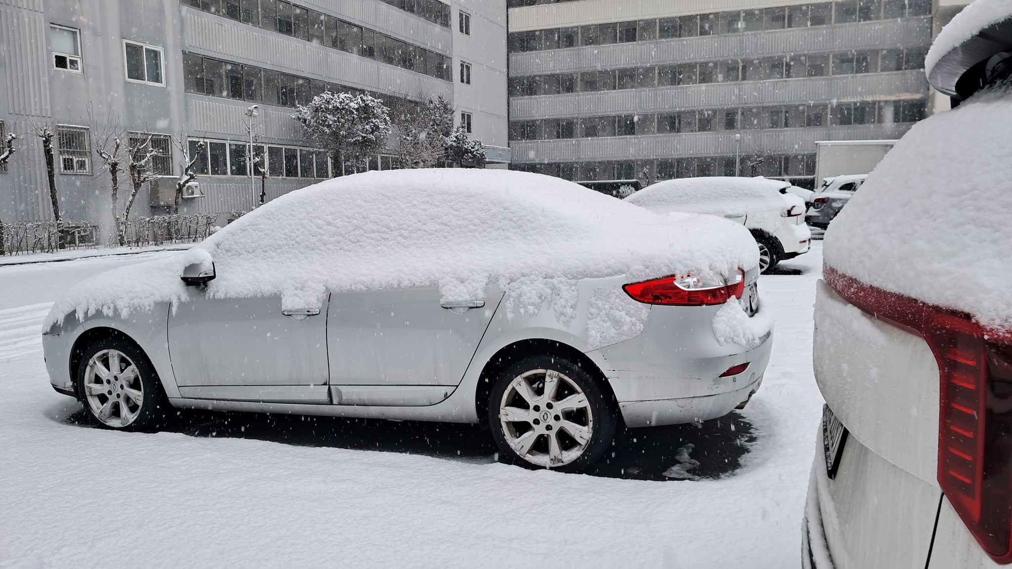 차엔 눈이 수북이 쌓여있다.